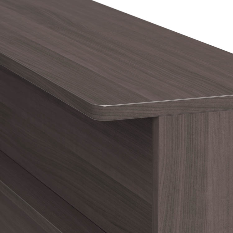 The durable thermally fused laminate surface protects against scratches, stains, and other cosmetic damage to preserve the modern reception desk's appearance throughout years of regular use.