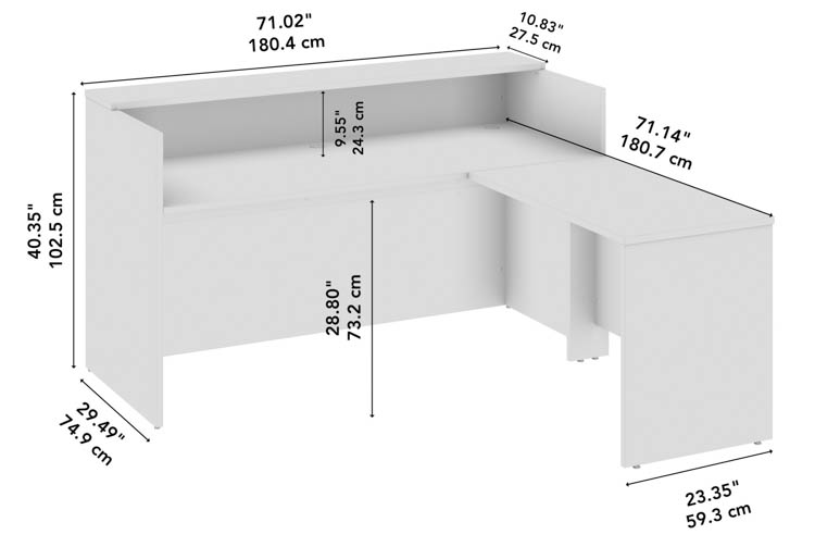 • Bundle includes: 72"W x 30"D Reception Desk with Shelf, 42"W Desk Return