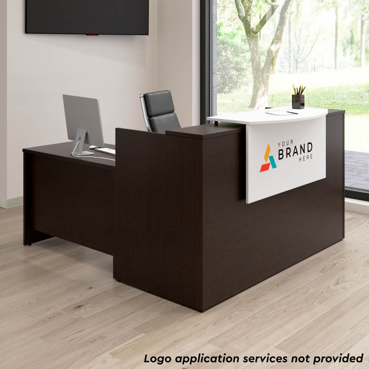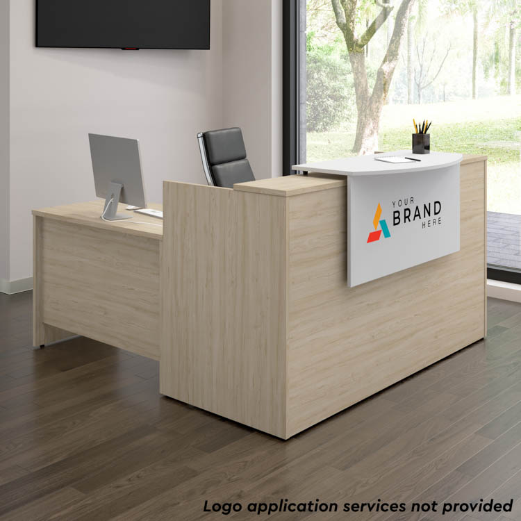 The reception counter's white finish and large front panel offer an ideal space to represent your business with a custom logo.