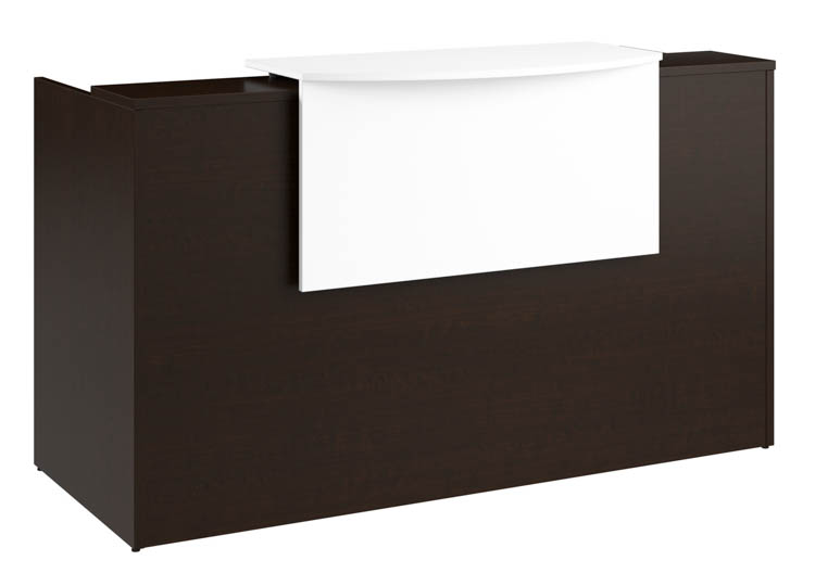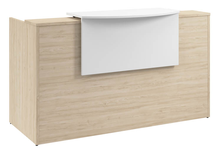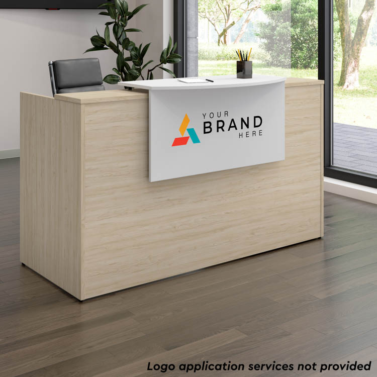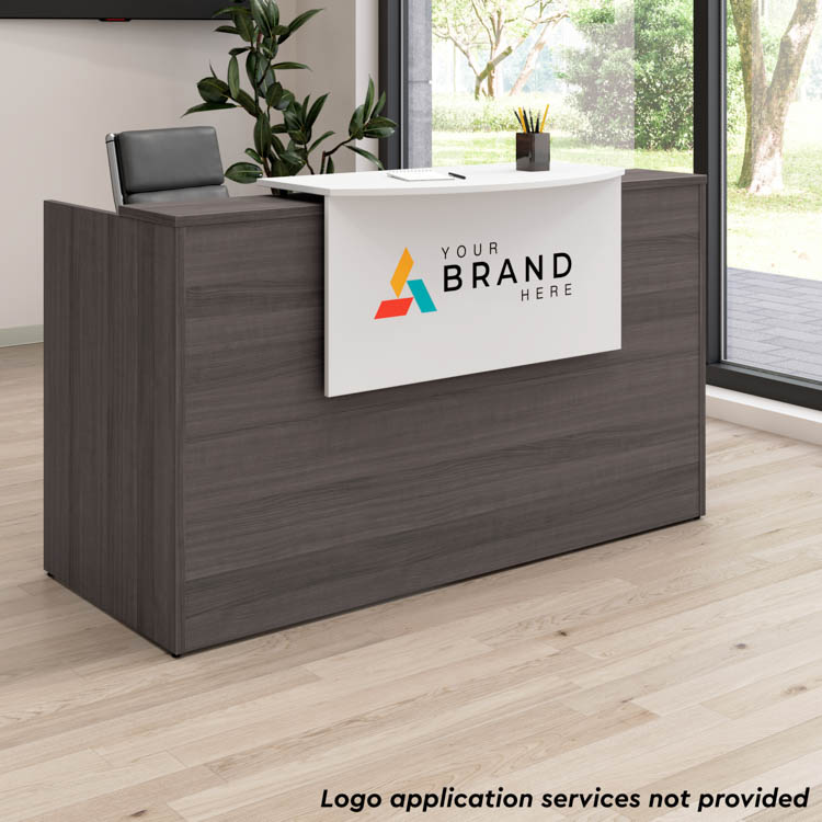 The reception counter's white finish and large front panel offer an ideal space to represent your business with a custom logo.