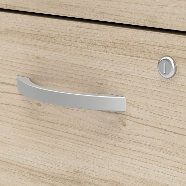 • Filing cabinet's lower drawer accepts letter, legal, and A4-size papers; two box drawers store office supplies
