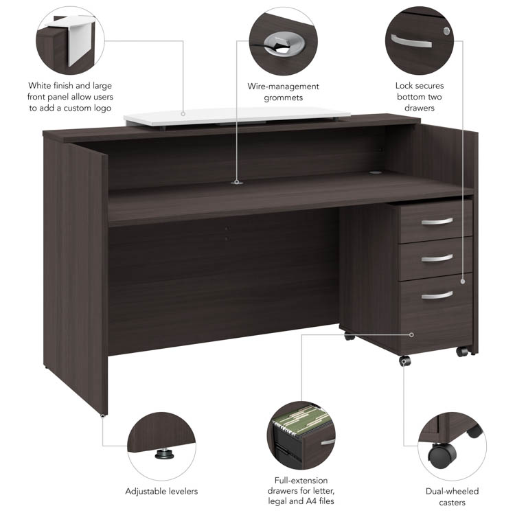 The Bush Business Furniture Arrive 72"W x 30"D Reception Desk with Counter and Mobile File Cabinet provides a stylish and practical solution for welcoming guests to your office's waiting room.