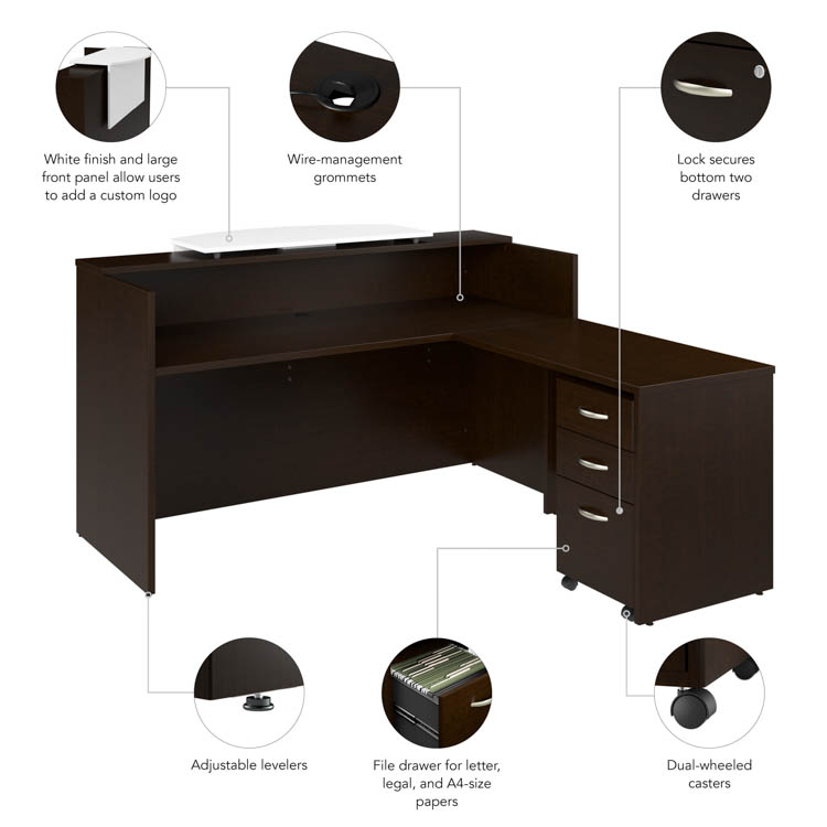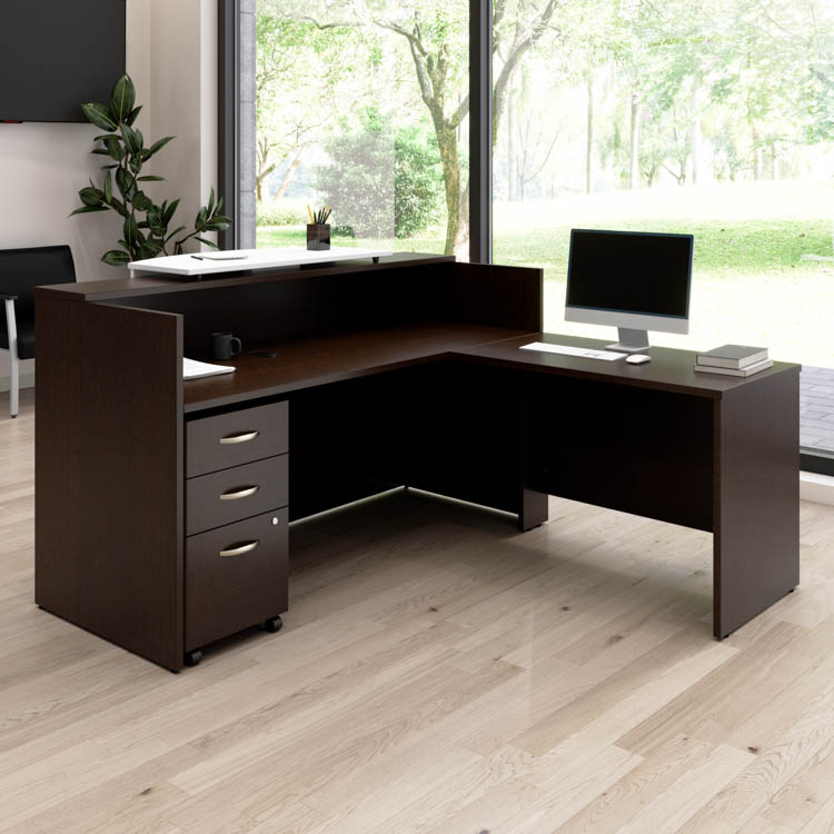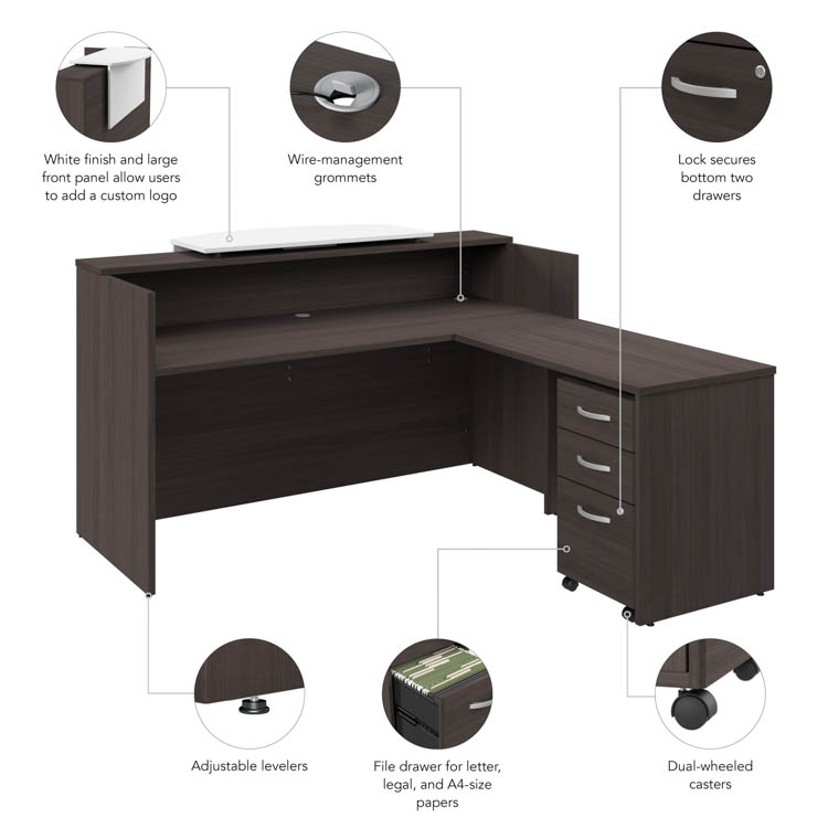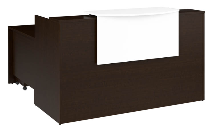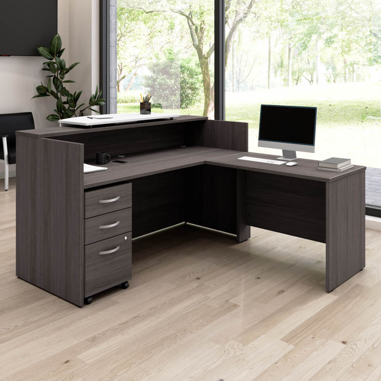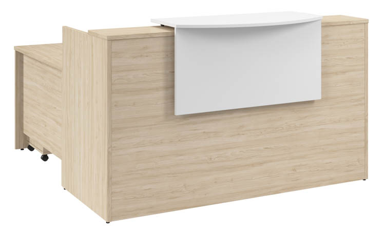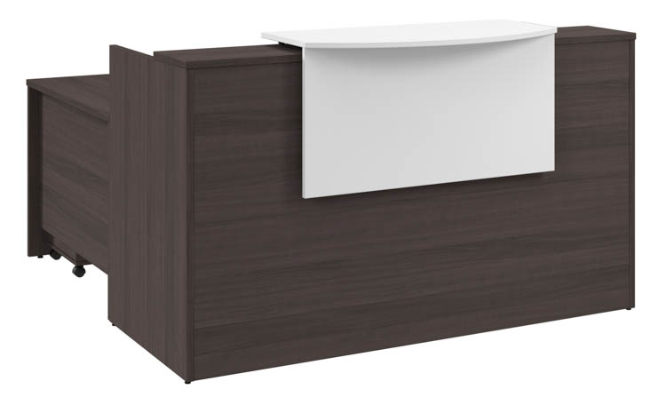 • Bundle includes: 72" W x 30" D Reception Desk with Shelf, 42" W Desk Return, Bow Front Reception Counter, 3 Drawer Mobile File Cabinet
