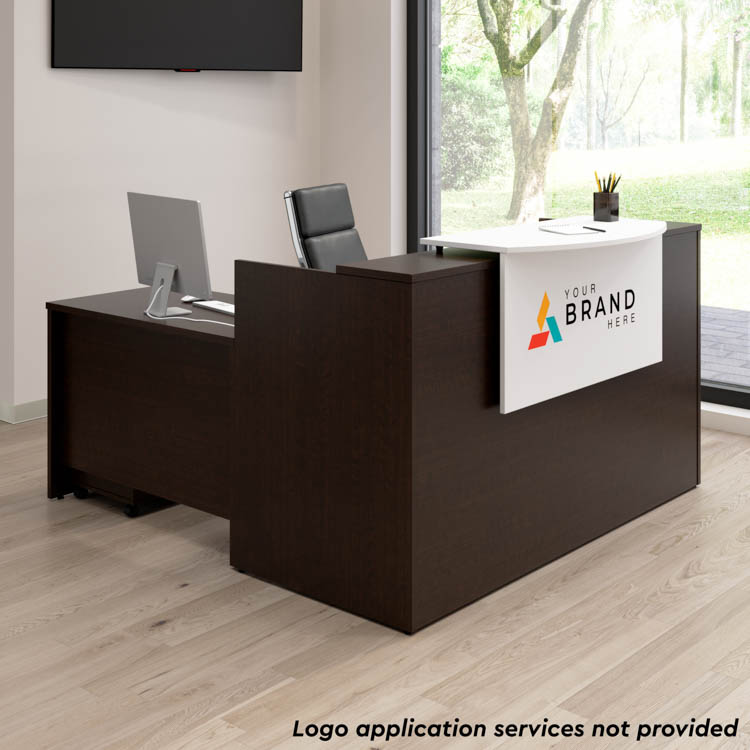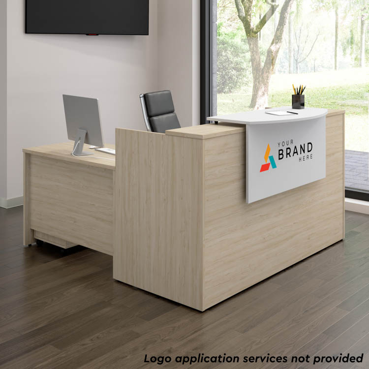 The reception counter's white finish and large front panel offer an ideal space to represent your business with a custom logo.