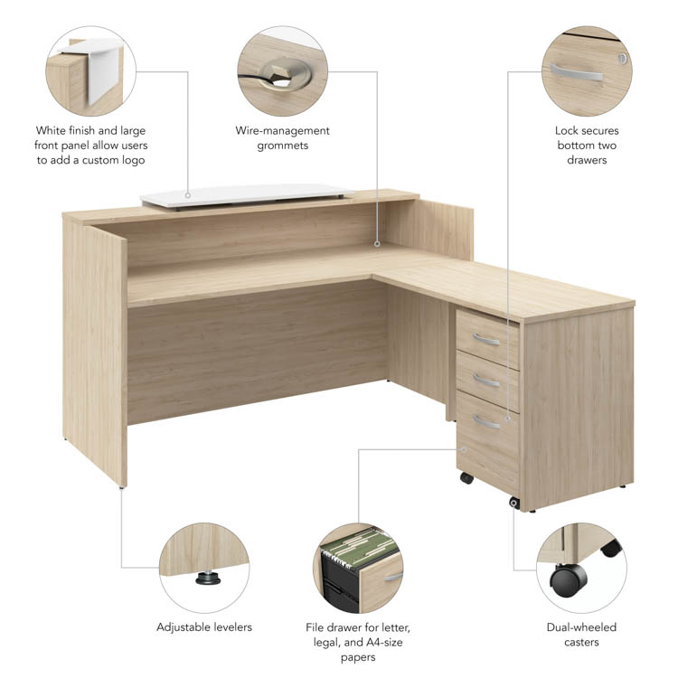 The Bush Business Furniture Arrive 72"W x 72"D L-Shaped Reception Desk with Counter and Mobile File Cabinet provides a stylish and practical solution for welcoming guests to your office's waiting room.