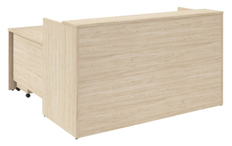 • L-shaped front desk with shelf and drawers is finished on all sides to look great facing any direction in a waiting room