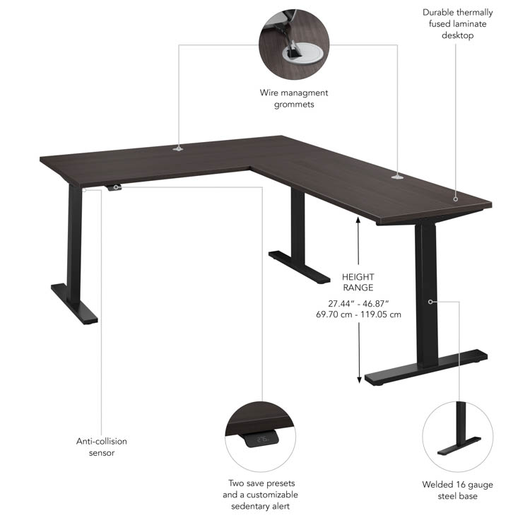 • Your New Favorite Desk: L-Shaped Standing Desk includes a motorized base with 60" W x 30" D and 48" W x 24" D surfaces; assembled L-desk measures 60" W x 78" D