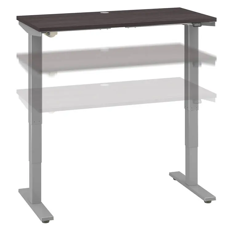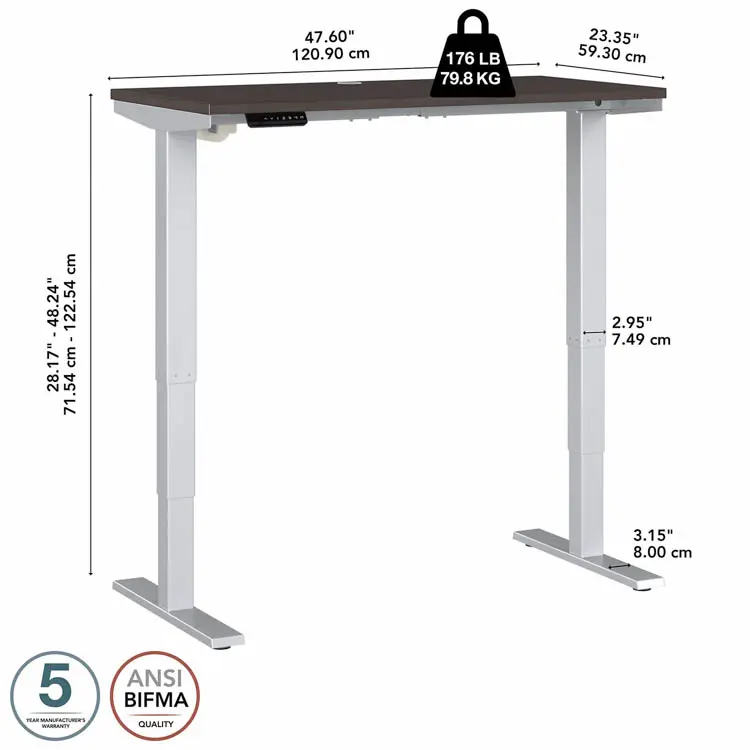 Three stage units lift the 48" W x 24" D desktop anywhere from 28 to 48" from the floor at a speed of 1.25" per second.