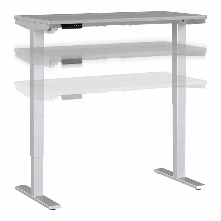 Three stage units lift the 48" W x 24" D desktop anywhere from 28 to 48" from the floor at a speed of 1.25" per second.