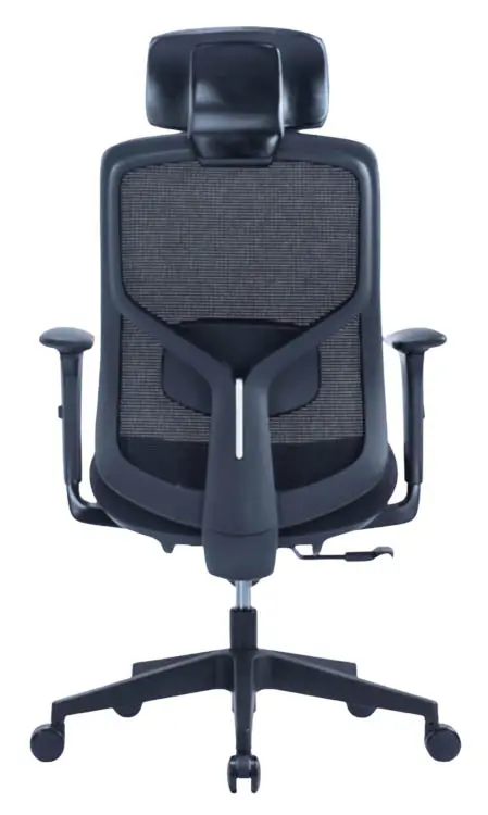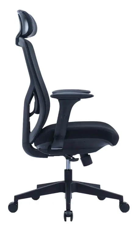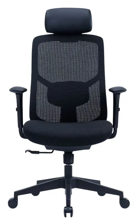 Ergonomic task chair with thick cushion seat, adjustable lumbar and height adjustable arms.