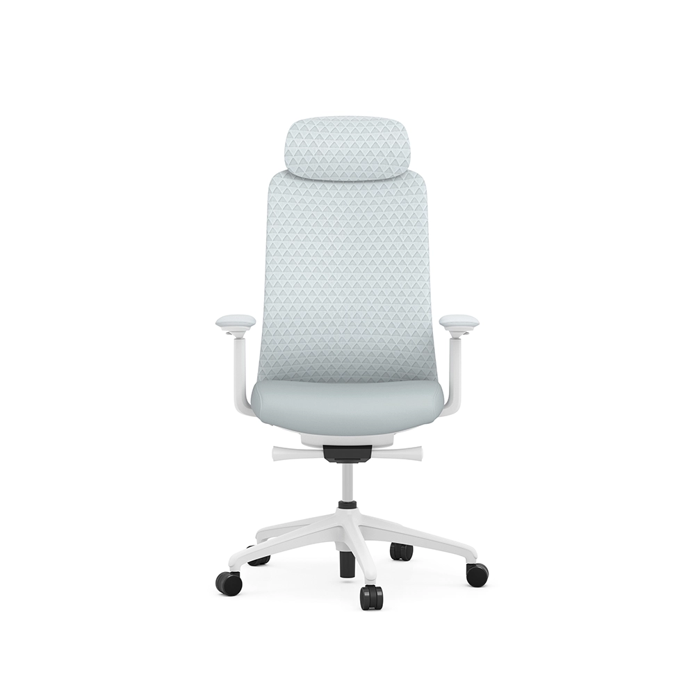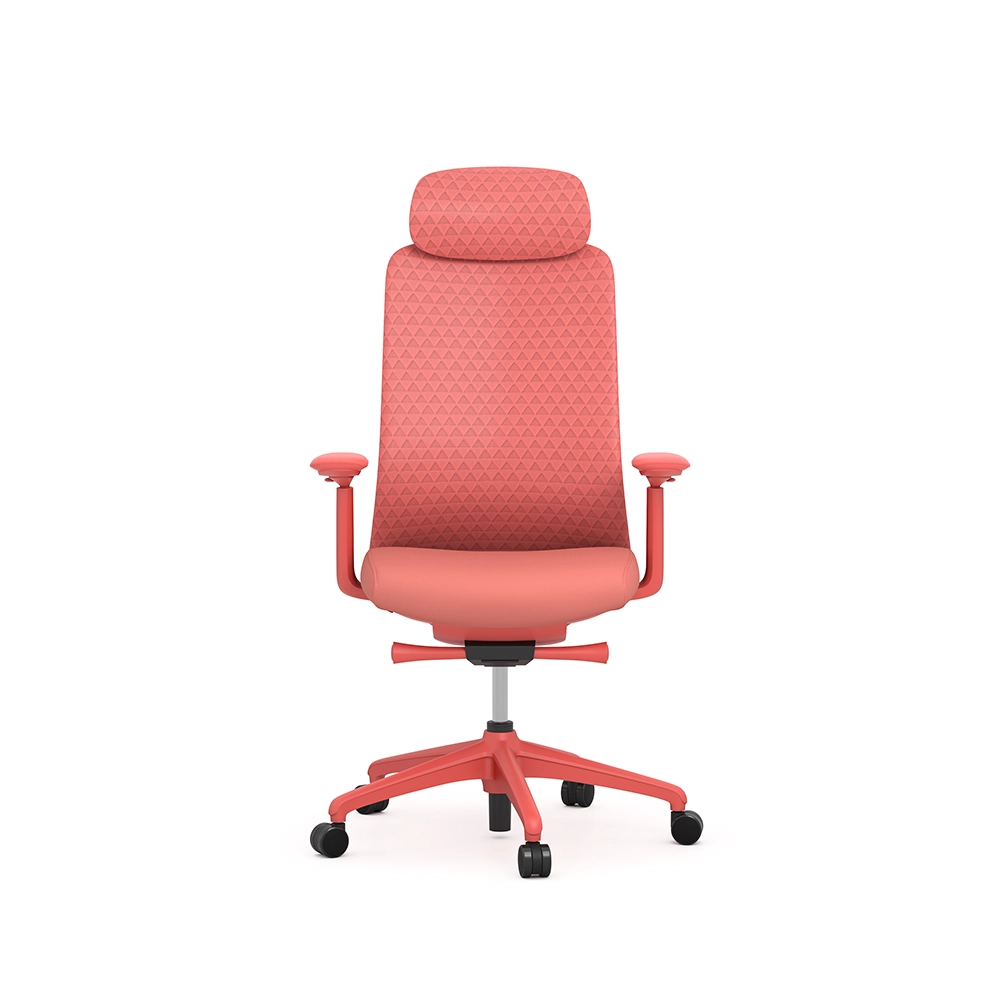 Trinity high-back chair with adjustable headrest features a matching colorful fabric, frame and decorative mesh combination that is as comfortable as it is unique.